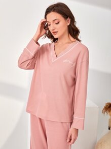 SHEIN Mulvari Letter Embroidery Contrast Piping Sleep Top