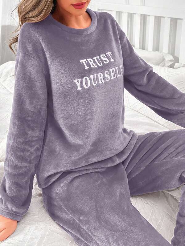 Letter Embroidery Drop Shoulder Flannel Lounge Top