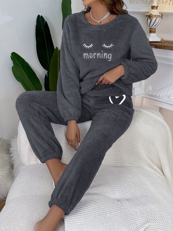 Letter Embroidery Flannel Top & Pants PJ Set