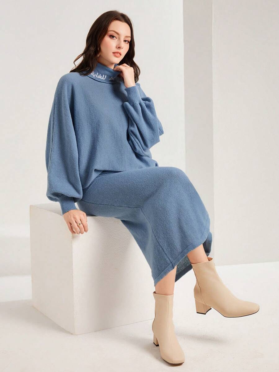 SHEIN Mulvari Letter Embroidery Turtleneck Batwing Sleeve Sweater & Knit Skirt