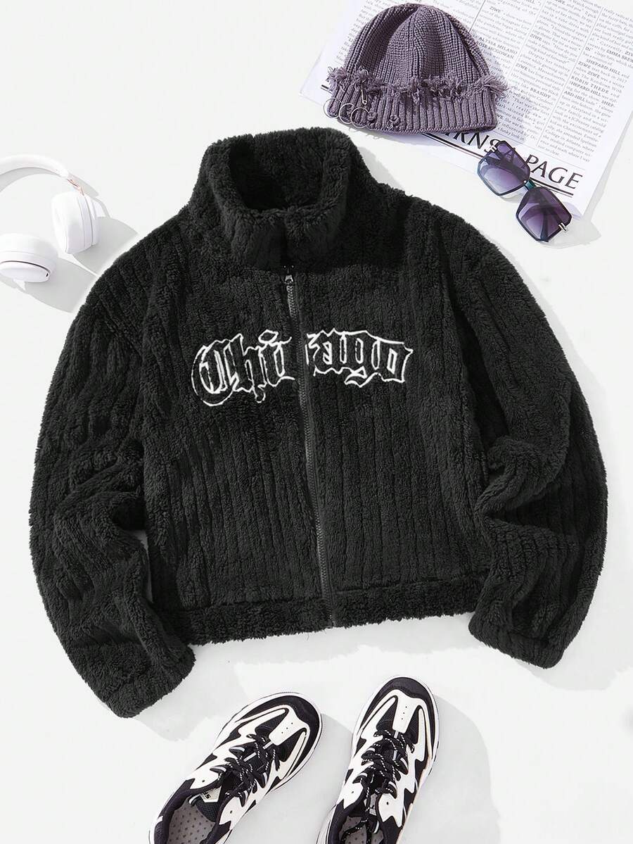 SHEIN Coolane Letter Embroidery Zip Up Teddy Jacket