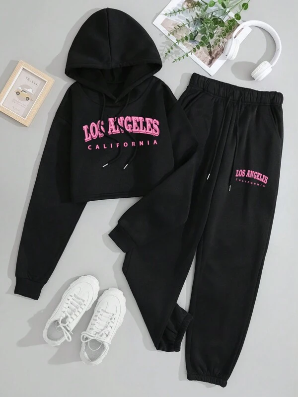 Letter Graphic Drawstring Thermal Lined Hoodie & Sweatpants