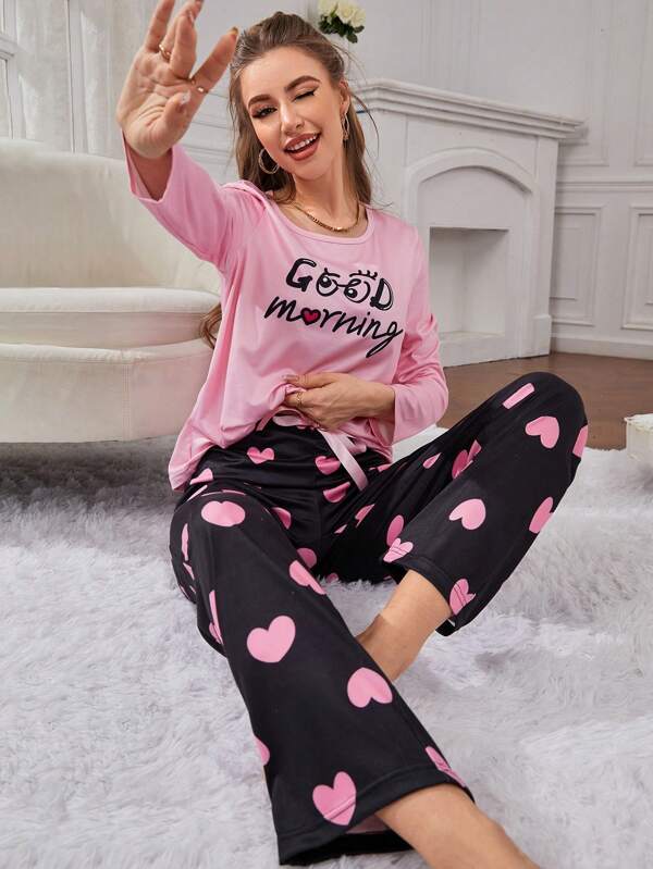 Letter Graphic Tee & Heart Print Pants PJ Set