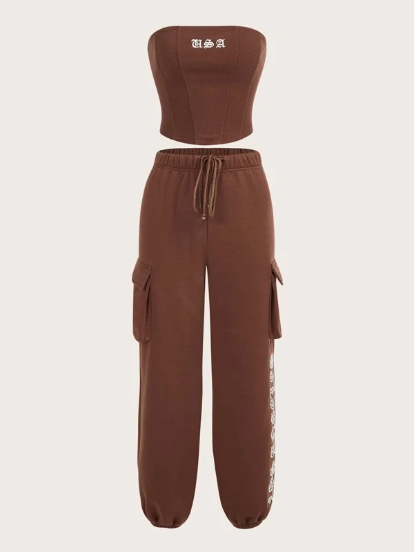 SHEIN ICON Letter Graphic Tube Top & Flap Pocket Side Sweatpants