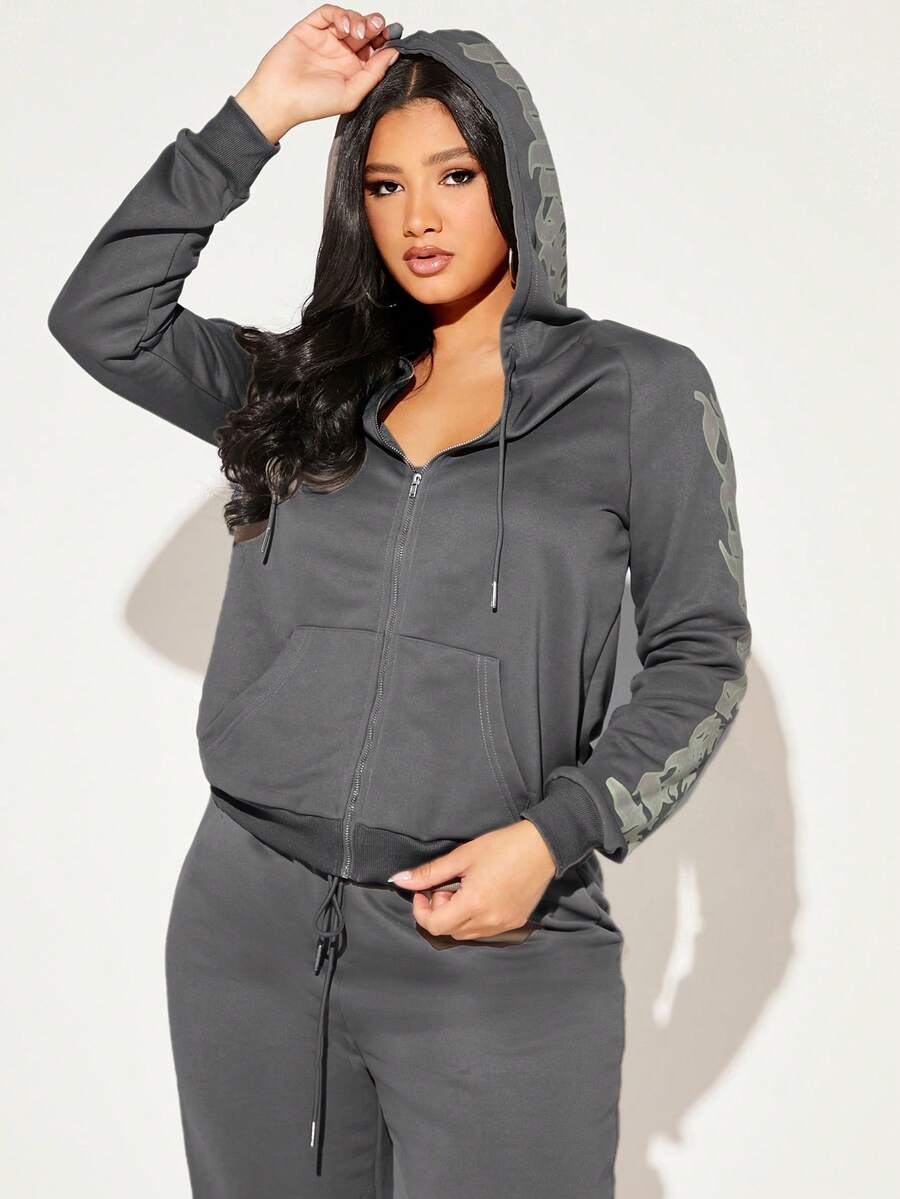 SHEIN SXY Letter Graphic Zip Up Drawstring Hoodie