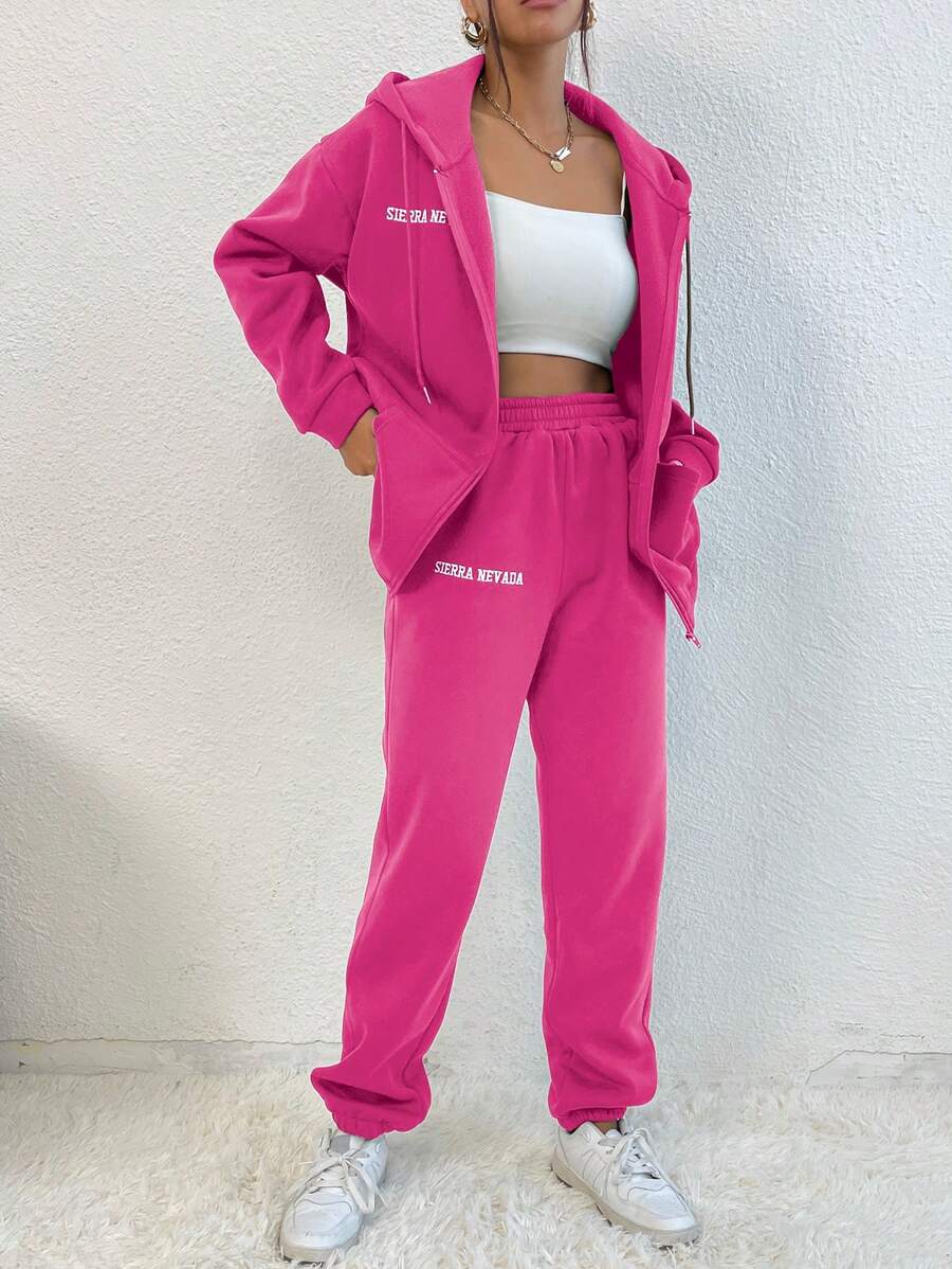 Letter Graphic Zip Up Drawstring Thermal Lined Hoodie & Sweatpants