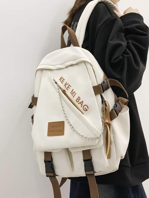 Letter Patch Chain Decor Functional Backpack School Bag For Graduate, Teen Girls, Freshman, Sophomore, Junior & Senior In College, University & High School, Perfect For Outdoors ,Travel & Back To School