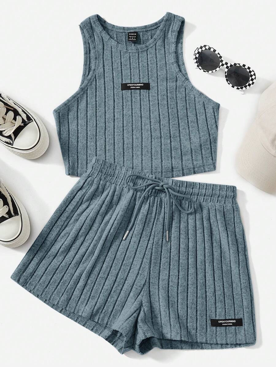 SHEIN EZwear Letter Patched Detail Tank Top & Drawstring Waist Shorts