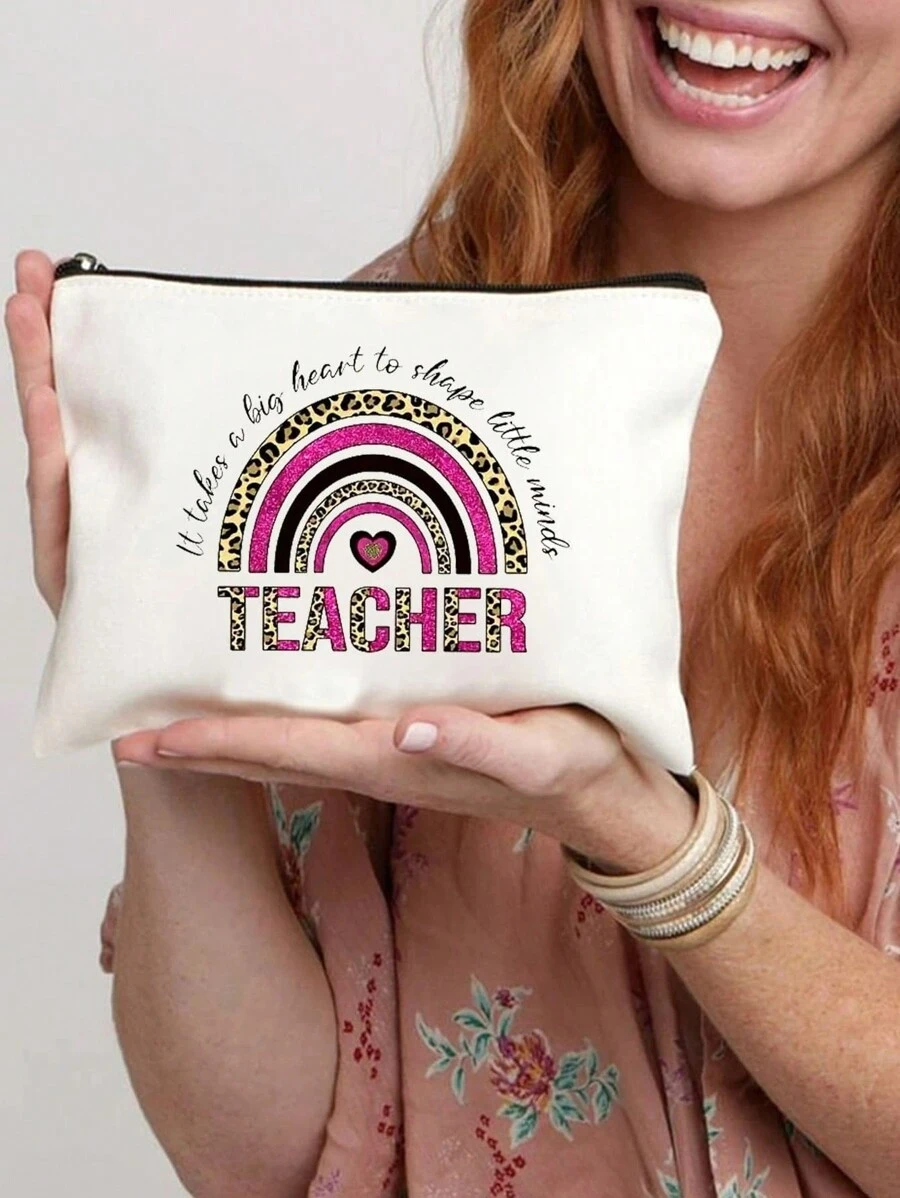 Letter Print Rainbow Pattern Cosmetic Bag, Teacher Travel Toiletry Organizer, Makeup Bag, Purse Pencil Pen Case, School Pencil Case, Stationery Supplies Bag, Teachers Gift Ideal Brides Maid Gifts