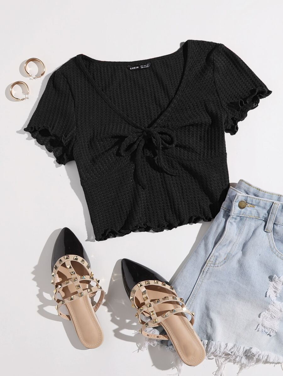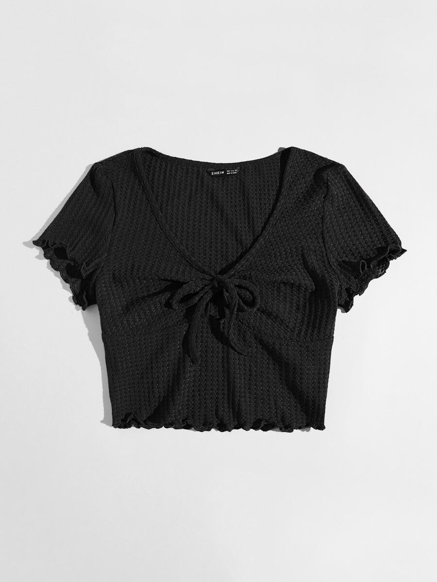 SHEIN Qutie Lettuce Trim Knot Front Waffle Knit Tee