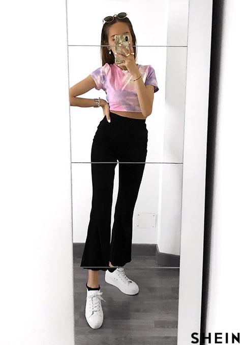 SHEIN PETITE Lettuce Trim Rib-knit Flare Leg Pants