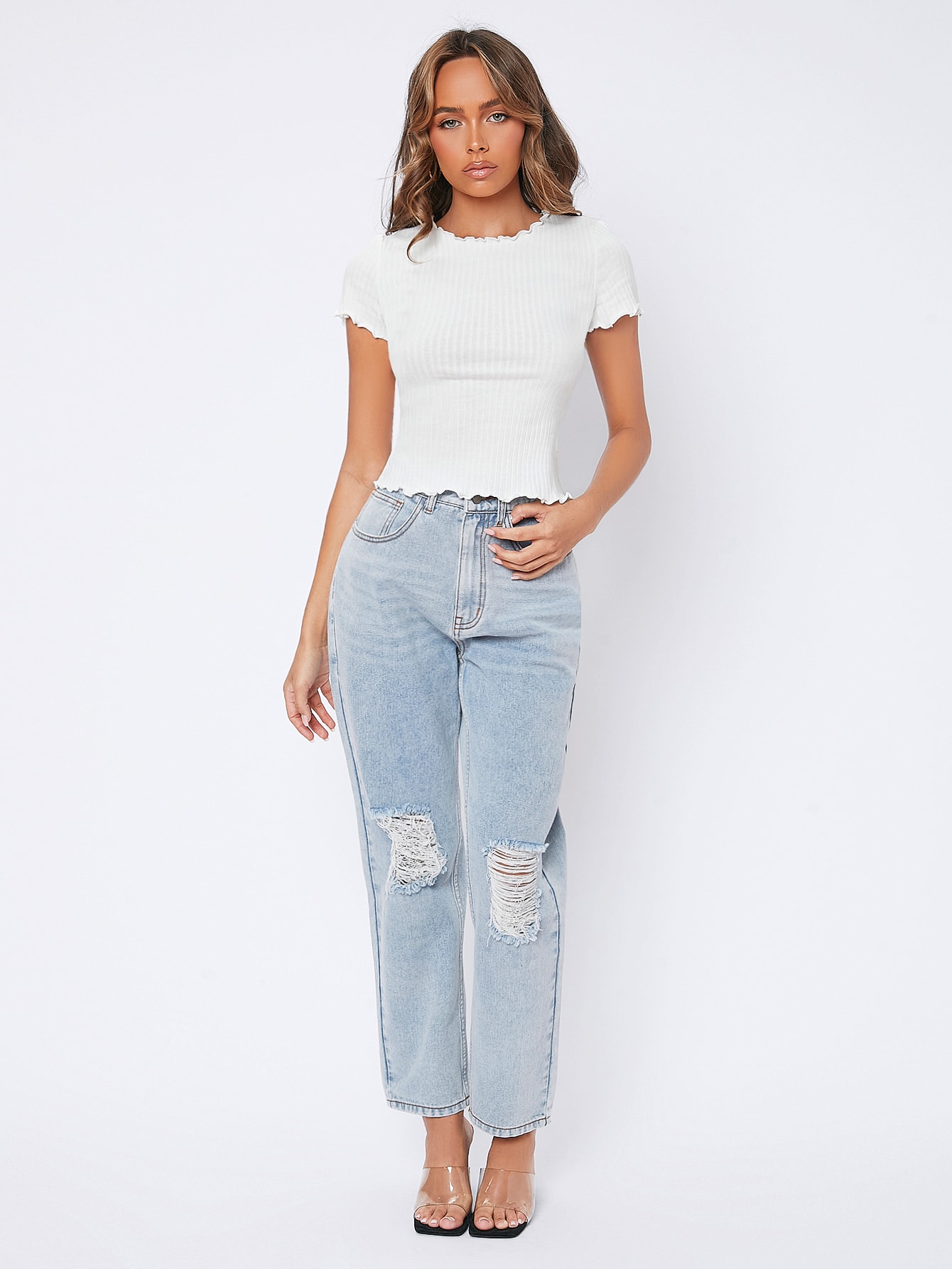 SHEIN PETITE Lettuce Trim Rib-knit Tee