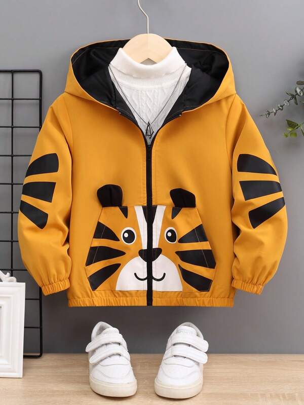 SHEIN Kids QTFun Little Boys' Casual Street Style Loose Fit Hooded Jacket With Cute Cartoon Tiger Print, 3d Ears And Pockets, Autumn And Winter
