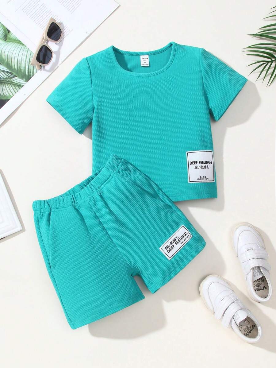 SHEIN Kids EVRYDAY Little Boys' Checkered Patchwork Short Sleeve T-Shirt And Shorts Set