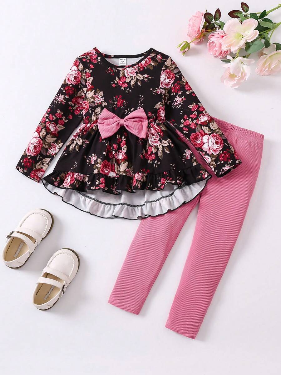 SHEIN Kids FANZEY Little Girls' Flower Printed Top With Bow Decor And Solid Color Leggings 2pcs/Set