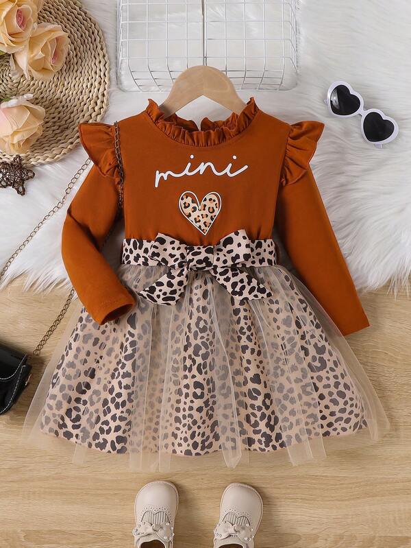 SHEIN Kids EVRYDAY Little Girls' Heart & Letter Print Mesh Panel Dress