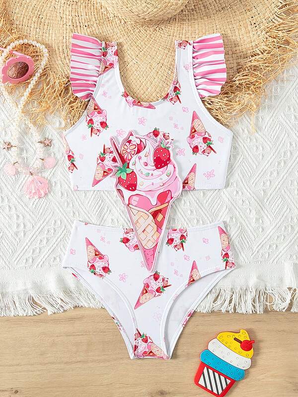 Little Girls' Ice Cream Printed Patchwork Ruffle Swimsuit