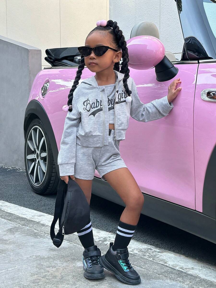 SHEIN Kids EVRYDAY Little Girls' Letter Print Hoodie With Cami Top And Shorts 2pcs Set