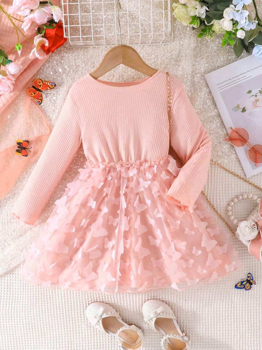 SHEIN Kids EVRYDAY Little Girls' Long Sleeve Butterfly Applique Mesh Dress