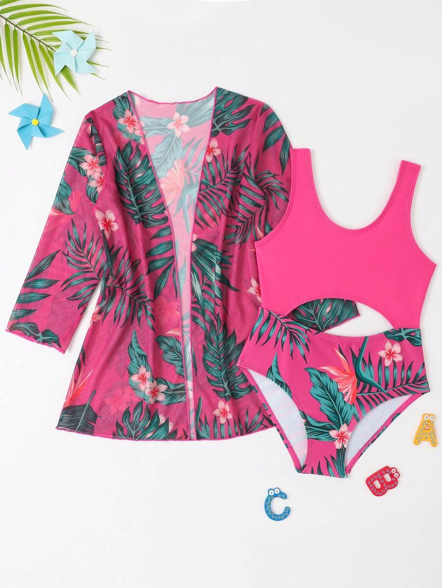 Little Girls' One-piece Swimwear With Green Plants Printed Bodysuit And Cover-up Set