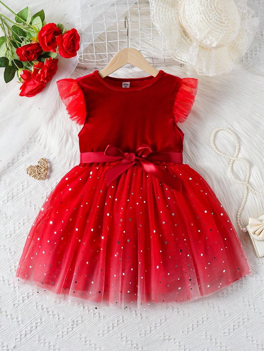 SHEIN Kids FANZEY Little Girls' Patchwork Glitter Mesh Flutter Sleeve Dress