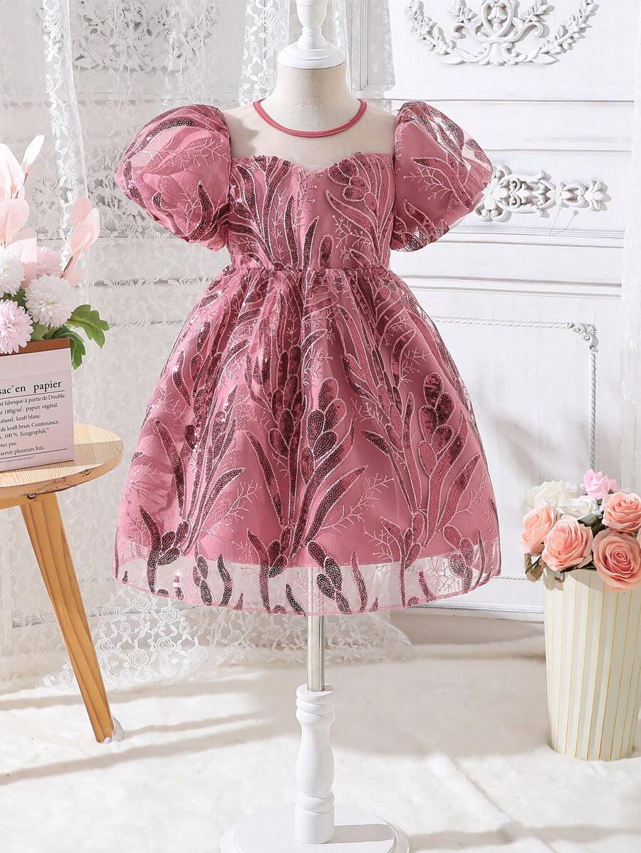 SHEIN Kids Nujoom Little Girls' Puff Sleeve Sequin Mesh Dress