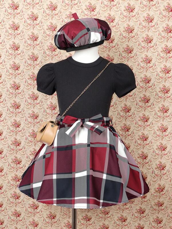 SHEIN Kids SUNSHNE Little Girls' Puff Sleeve Top And Checked Skirt Set With Hat