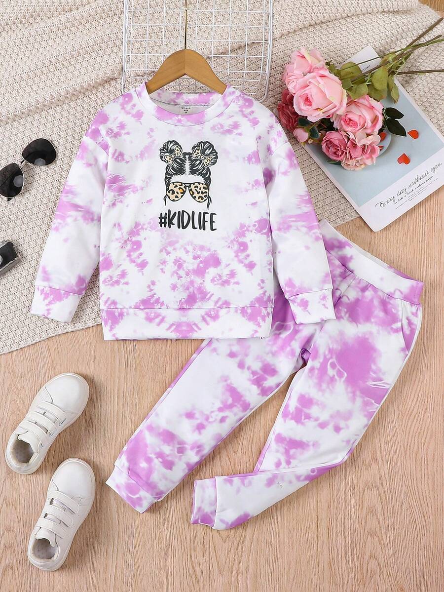 SHEIN Kids EVRYDAY Little Girls' Purple Tie-dye Casual Loose Fit 2-piece Set