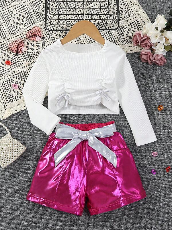 SHEIN Kids Cooltwn Little Girls' Ribbed Knit Long Sleeve Drop Shoulder Top And Shorts Casual Fashion Outfit