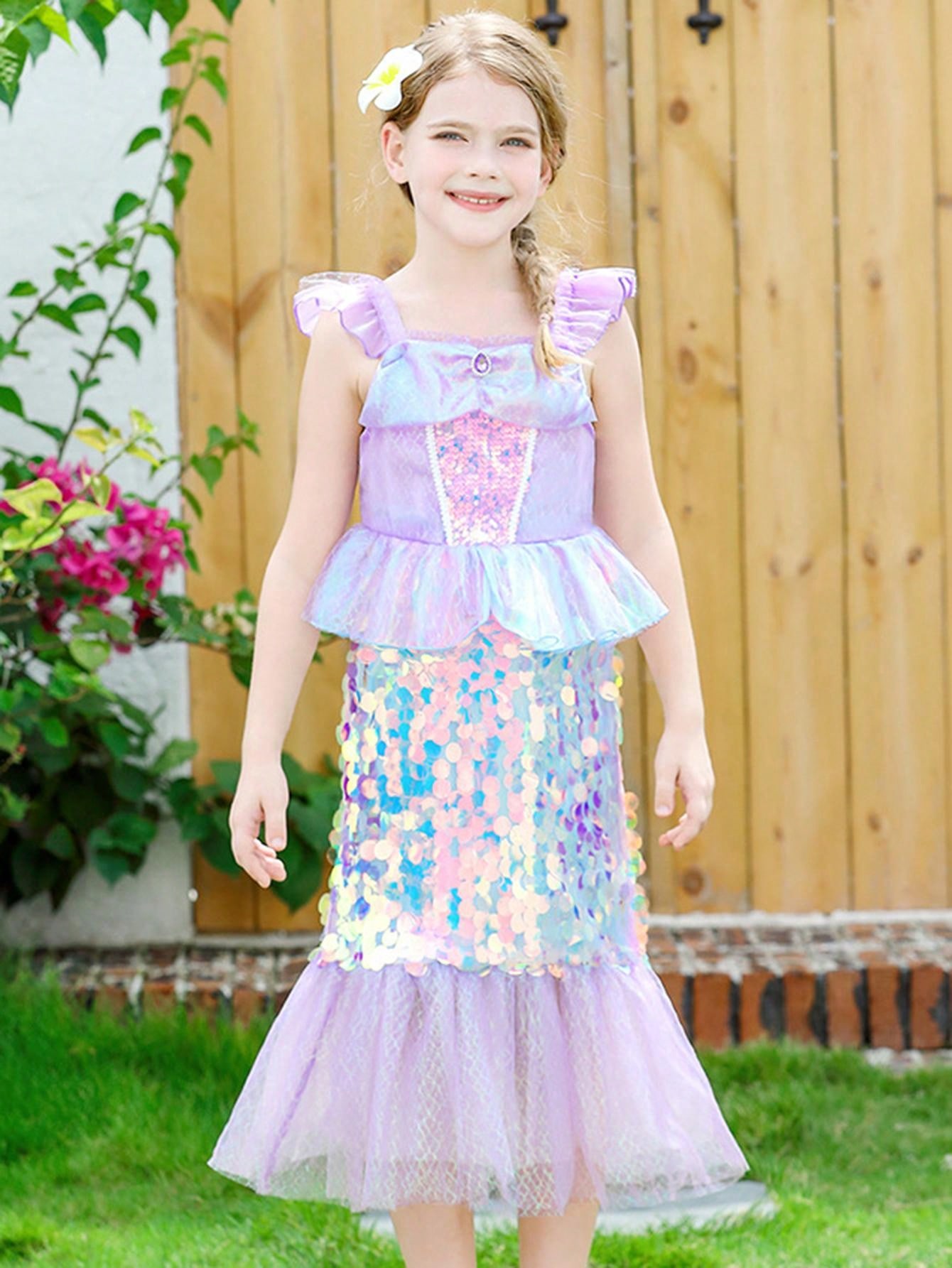 Little Girls' Sequined Mermaid Tail Dress With Mesh Ruffle Overlay & Flutter Sleeves, Perfect For Performance, Party, Evening Dress