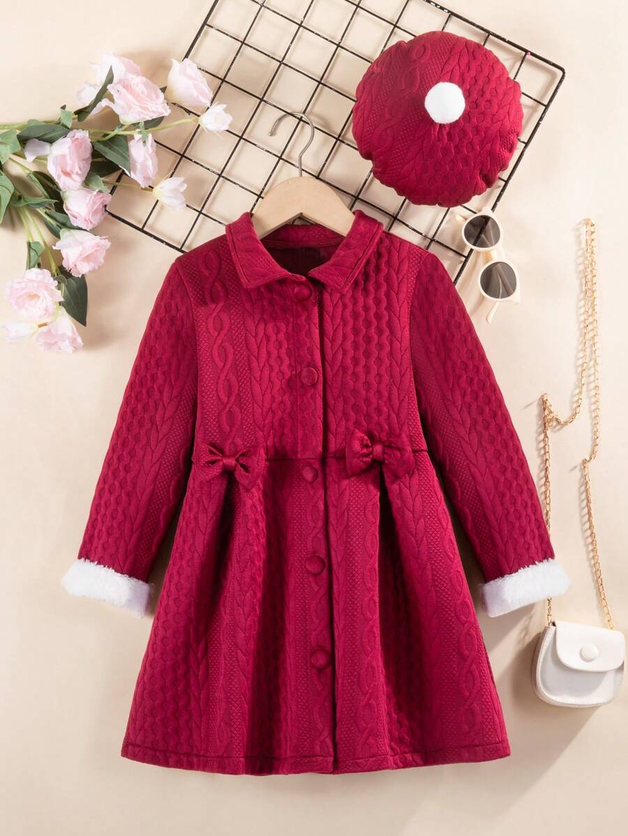 Little Girls' Simple & Fashionable Cap With Fuzzy Sleeve Cuffs & Bow Knot Decor Button-Up Dress, Autumn Winter
