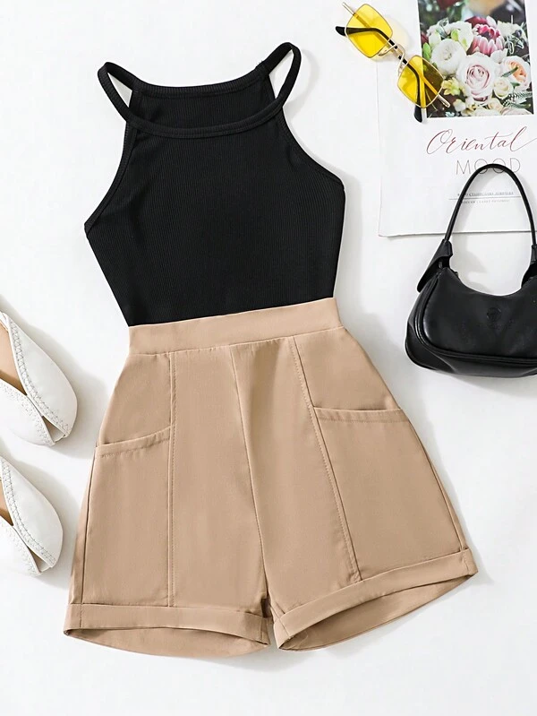SHEIN Kids Cooltwn Little Girls' Solid Color Vest And Shorts 2 Piece Set