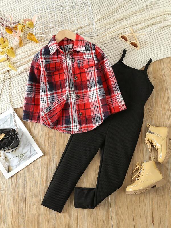 SHEIN Kids SUNSHNE Little Girls' Woolen Plaid Lined & Solid Color Jumpsuit, Chic And Casual 2pcs Set