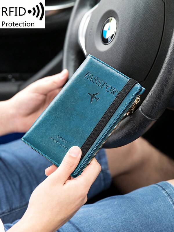 MIYIN Travel Passport Card Holder, RFID Blocking Multifunctional Passport Holder Case,Letter And Airplane Pattern PU Leather Lightweight Passport Wallet ,With Elastic Band&zip Coin Bag ,Travel Essentials,For Travel,Flight,Business, Vacation Holiday,For Men and Women,peacock blue