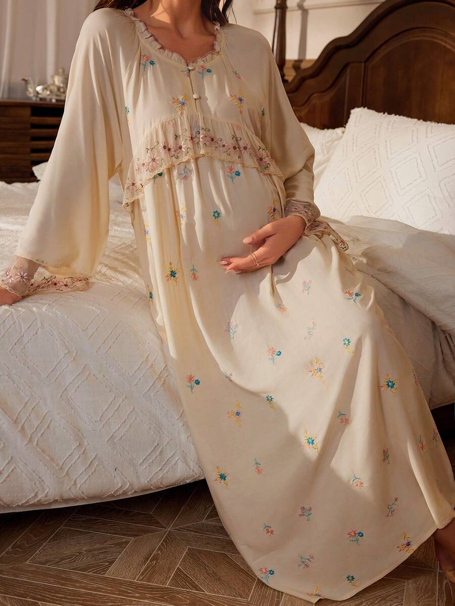 Maternity Floral Embroidered Mesh Trim Bell Sleeve Nightdress