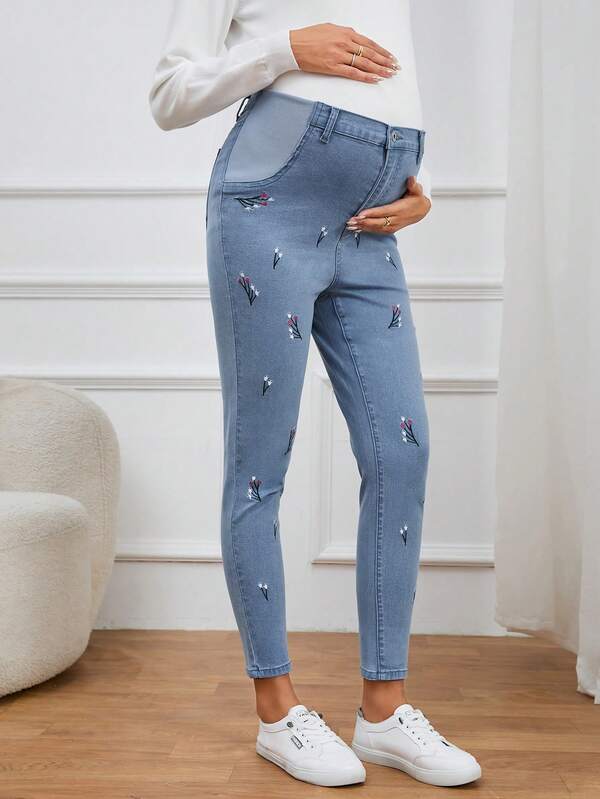 SHEIN Maternity High Waist Floral Embroidery Skinny Jeans