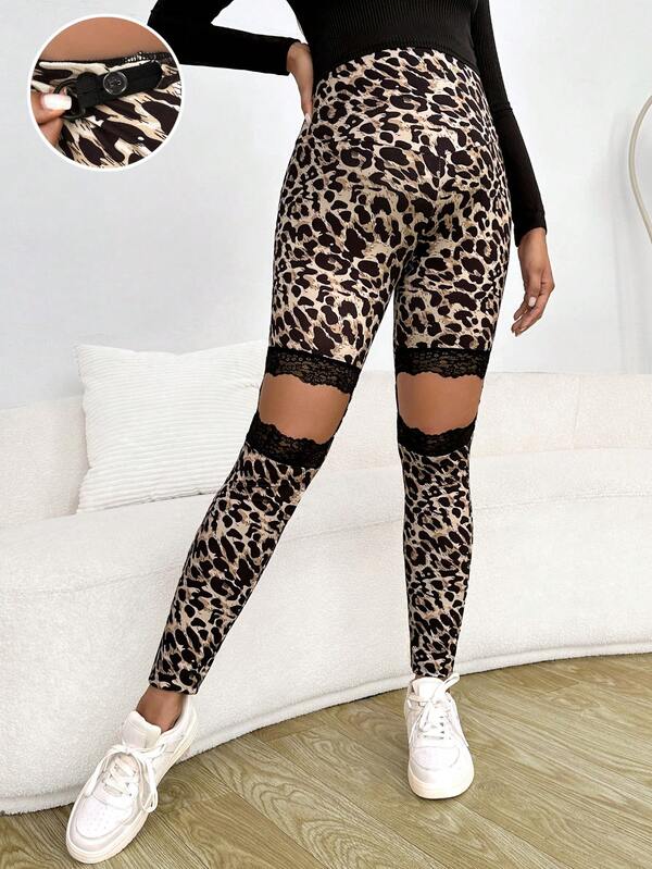 SHEIN Maternity Leopard Print Contrast Lace Cut Out Leggings