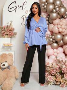 SHEIN Maternity Surplice Neck Lantern Sleeve Belted Blouse