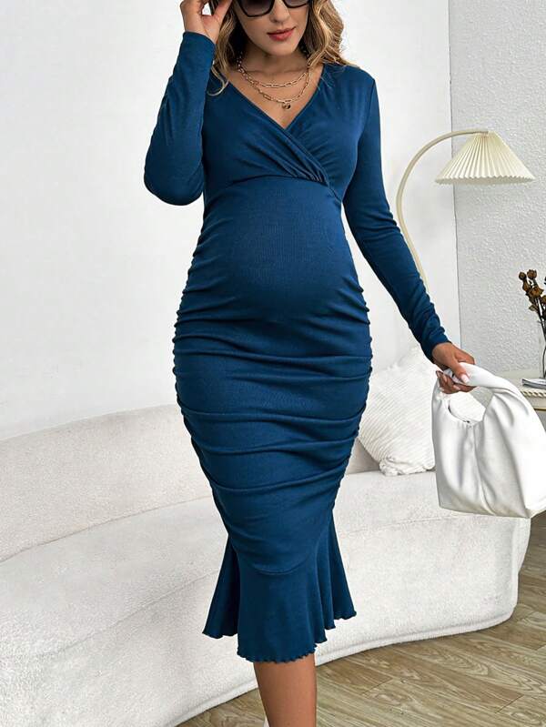 SHEIN Maternity Surplice Neck Ruched Mermaid Hem Bodycon Dress