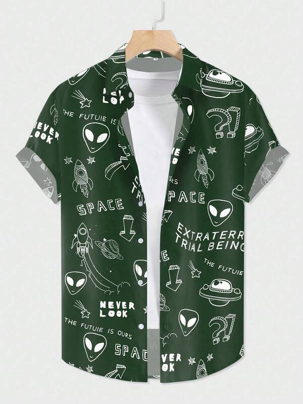 ROMWE Street Life Men'S Alien Print Short-Sleeved Shirt Is Suitable For Daily Use In Spring And Summer