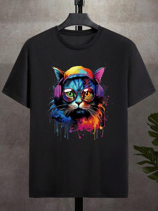 Men'S Cat Print Round Neck T-Shirt
