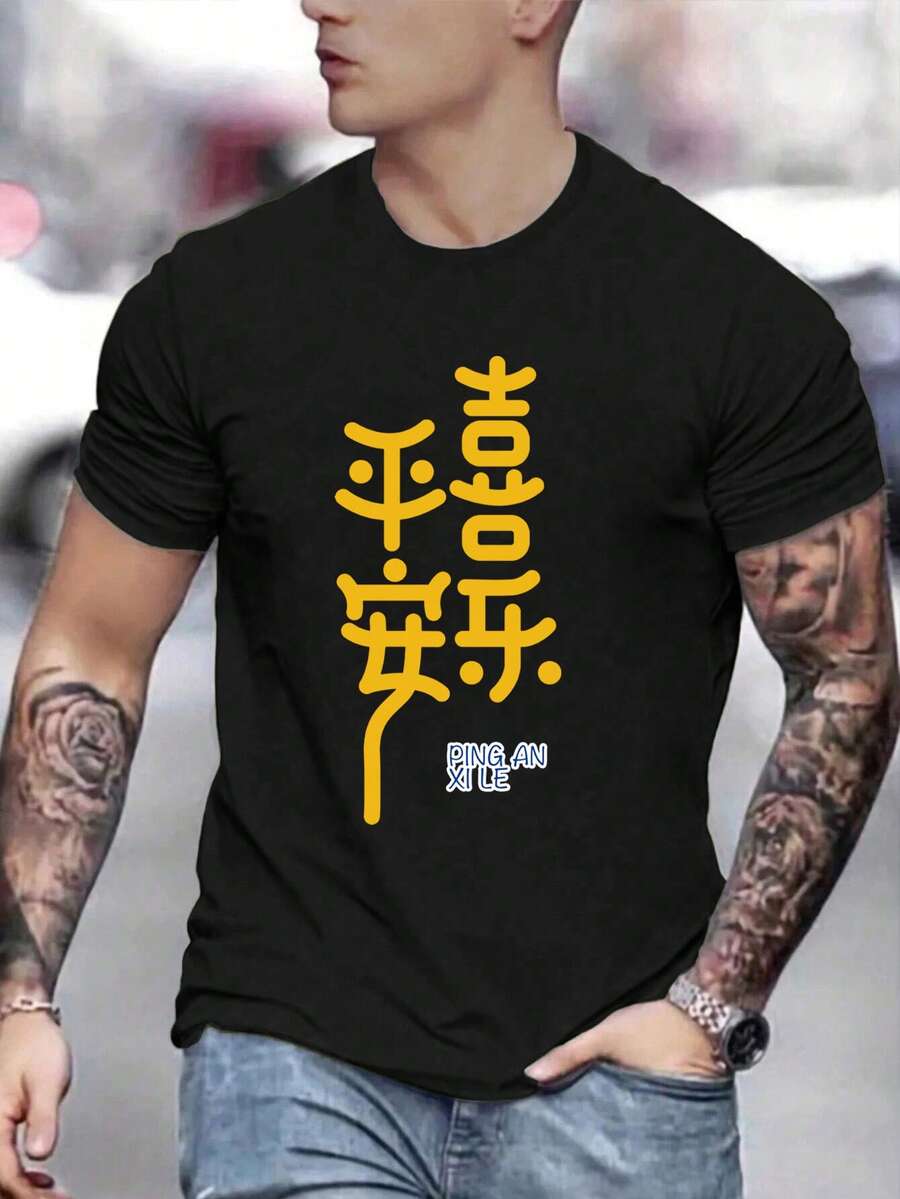 Men'S Chinese Slogan Print Short Sleeve T-Shirt