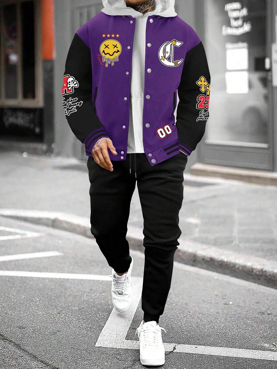 Manfinity Men'S Contrasting Cartoon Letter Print Jacket And Solid Color Trousers Two-Piece Set