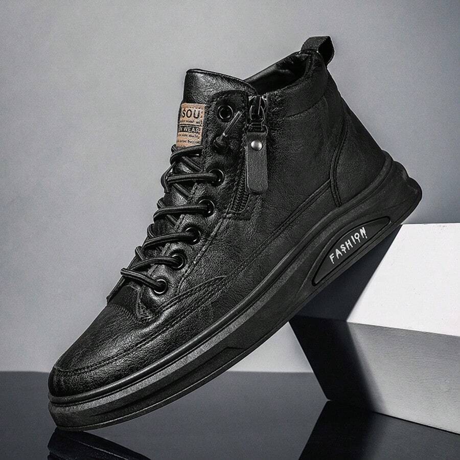 Men'S Fashionable Pu Leather Casual Shoes With Soft Insole, Thick Sole, Elastic Closure And Zipper, Suitable For All Seasons