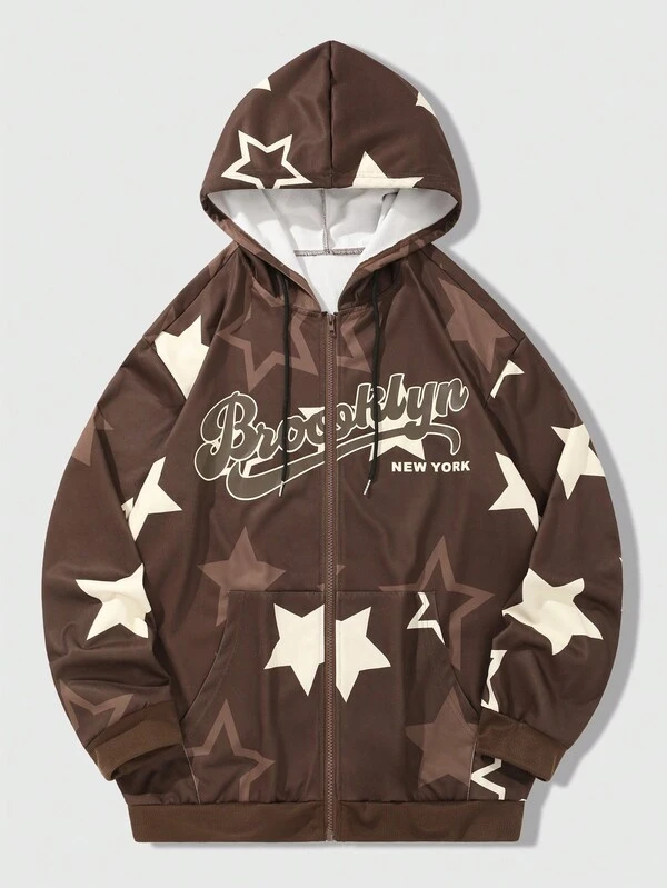 ROMWE Prep Men'S Hoodie With Kangaroo Pocket, Zipper Closure, Letter & Star Design