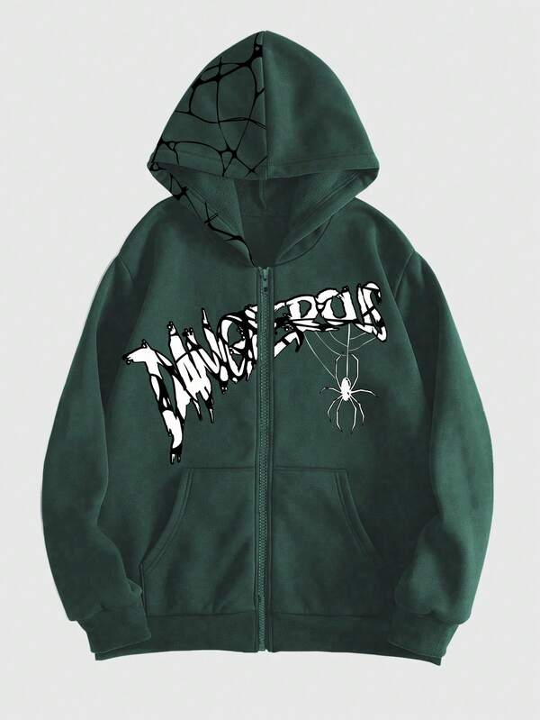 ROMWE Grunge Punk Men'S Letter & Spider Printed Zipper Front Hooded Sweatshirt With Long Sleeves