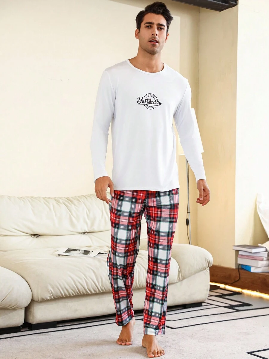 Men'S Letter And Plaid Print Pajama Set