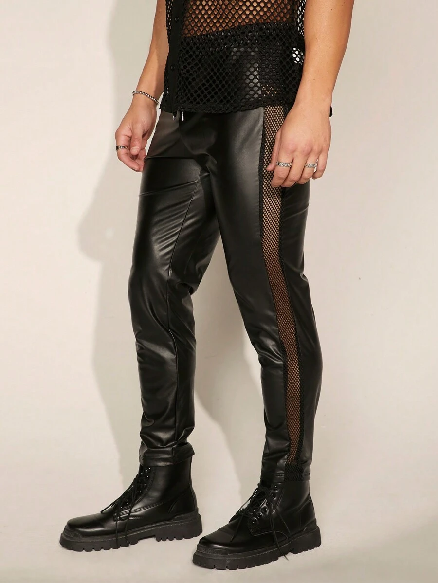 Manfinity Fever City Men'S Mesh Insert & Pu Leather Stripe Design Long Pants
