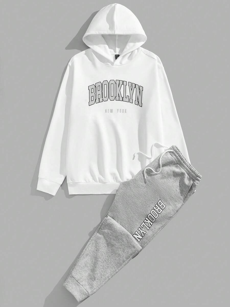 Manfinity EMRG Men'S Plus Size Letter Print Hooded Sweatshirt And Sweatpants Knitted Casual Two-Piece Set