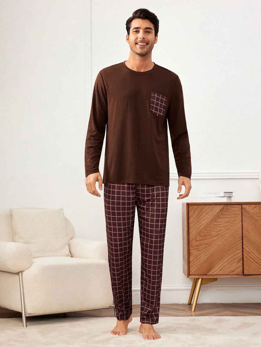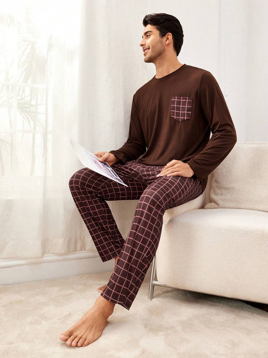 Men's Pocket T-Shirt And Plaid Pants Homewear Set